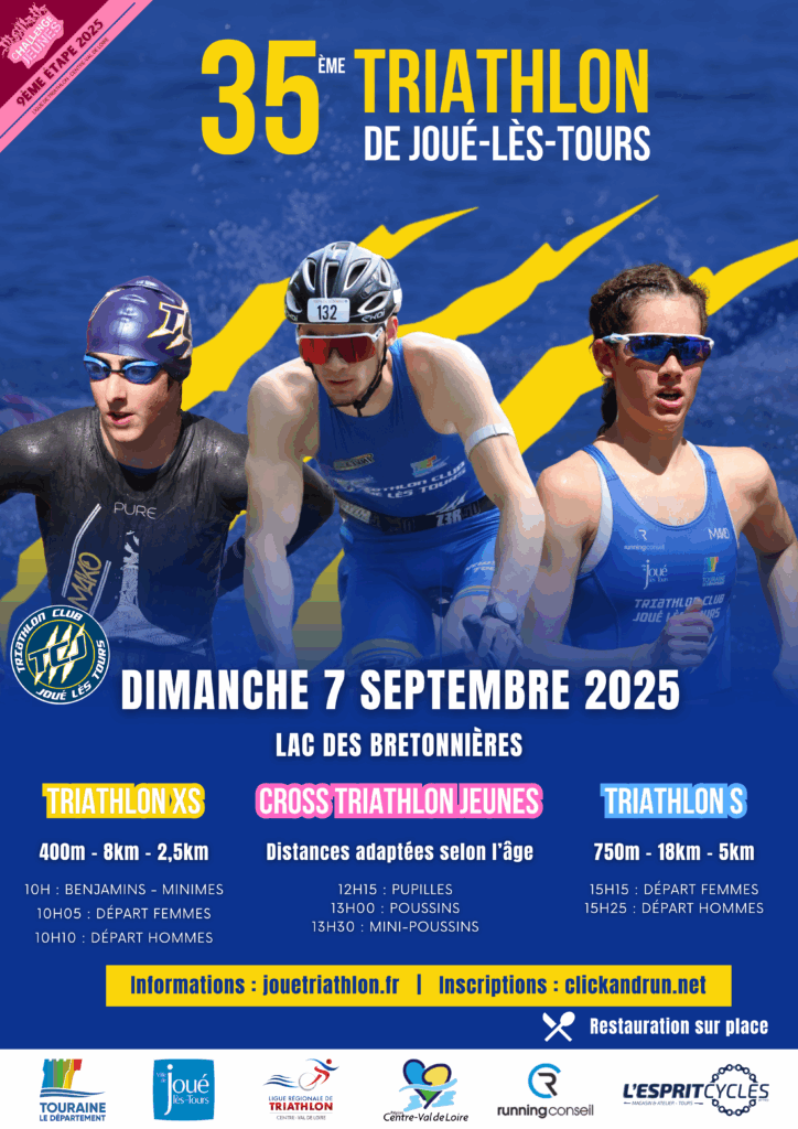 Le dimanche 7 septembre 2025, le Triathlon de Joué-lès-Tours revient pour sa 35ème édition au Lac des Bretonnières.