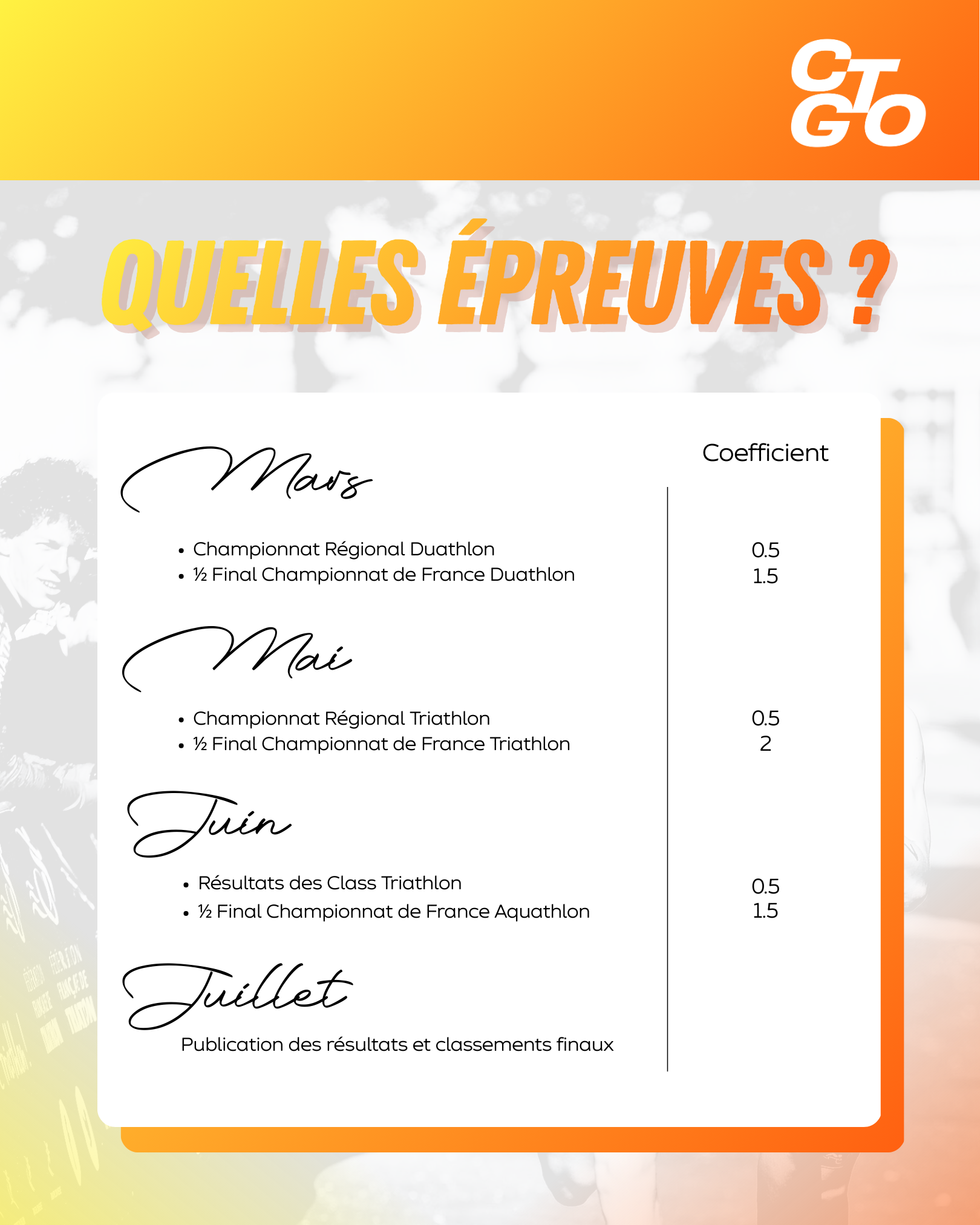 Le CHALLENGE TRIATHLON GRAND OUEST (CTGO) 2025 est constitué de 4 étapes réparties en : Class Triathlon, les ½ finales de duathlon, triathlon et aquathlon. Les classements du Challenge sont effectués sur le total de ces résultats résultats.