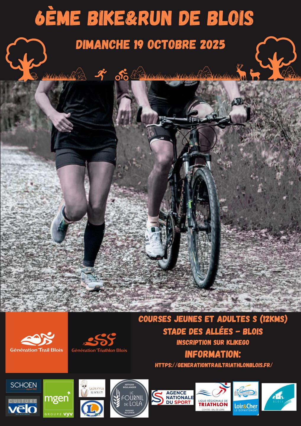 Organisation de la 6ème édition du Bike and Run de Blois le dimanche 19 octobre 2025. 1,5km pour les mini-poussins 3km pour les poussins et pupilles 6km pour les benjamins et minimes 12km à partir de cadets 📩 Inscriptions sur : klikego.com ℹ️ Informations sur : generationtrailtriathlonblois.fr